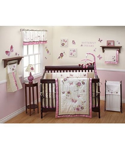 - Includes comforter, fitted Sheet, bumper, dust ruffle, diaper stacker and valance